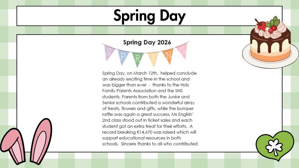A huge 'Thank You' to all involved in making Spring Day 2026 such a success! Without your support as parents/guardians, extended family, the local community and of course all the sponsors, this annual event would not be the success it has always been. The phenomenal €14,670 raised this year is just amazing.Continued thanks to the Parents Association who give so generously of their time organising this event by sourcing prizes for the raffle, making the Mothers' Day/Easter gifts etc. Without them we would not be able to host such a successful and enjoyable event for the school community. All funds raised at our fundraising events are shared between both schools for the benefit of all children. A large number of members are finishing this year as their children move on to the next chapter of their school lives. We would like to extend our thanks for the commitment and support you have shown the schools over the time you have been on the Parents' Association and wish you and your children every success in the future.