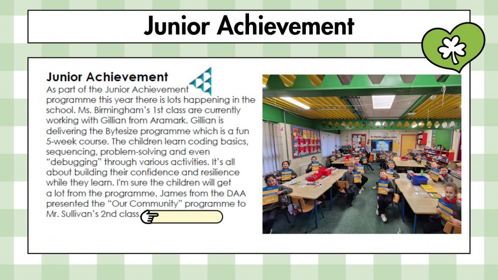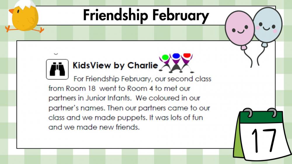 Friendship February has been a joyful celebration of kindness and connection across our school! Our Junior Infants paired with 2nd Class, while Senior Infants teamed up with 1st Class for two special friendship activities. First, the children coloured in each other’s names, taking care and pride in their partner’s work. Next, they created stick puppets of one another, sparking lots of laughter and creativity. Throughout the activities, everyone practised being good friends by sharing materials, helping one another, and using kind words. Friendship February has been a wonderful reminder that small acts of kindness make a big difference every day. Click here for pictures.